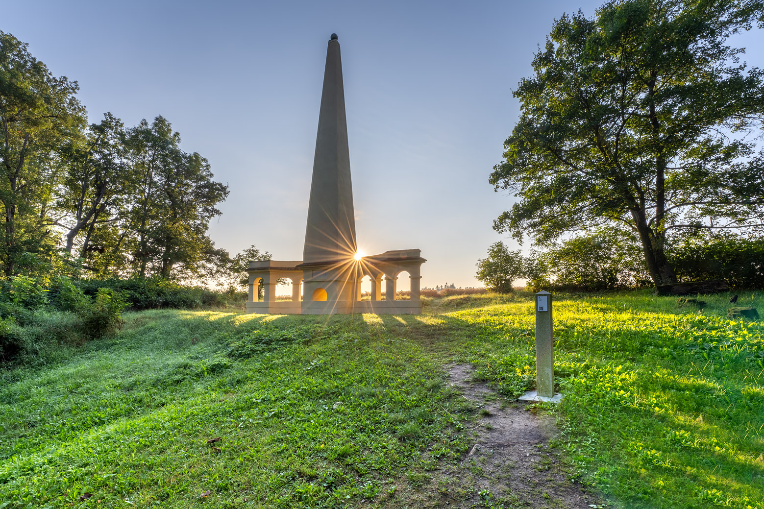 The new English garden, established by Count Odoardo of Collalto in 1801 on a location originally occupied by a pheasantry, was designed by Anton Ortner, the Count’s young architect and graduate of the Viennese Academy of Fine Arts. At the time, Ortner also had a hand in remodelling the interiors of Uherčice Château. From its very inception, the plan for the English park included several romantic follies, a standard feature of most aristocratic gardens in Central Europe. For instance, obelisks imitating Egyptian and Roman models and erected on elevated, visually interesting spots were de rigueur. At Uherčice the groundwork for a monument of this kind was laid in autumn 1801. It seems, however, that the obelisk itself was not built until 1808, when a local master mason received a fairly high amount of money from the Collaltos’ coffers. The design for the monument was provided by Ortner. It had a set of remarkable lateral arcades, a reference to contemporary pattern books. At around the same time, an obelisk with lateral wings was also built in the grounds of Kynžvart Château, belonging to the Austrian statesman Klemens von Metternich. In 1821, the yellow-painted obelisk – dubbed a “pyramid” by contemporary sources – neighboured on a water fountain and probably also on an adjacent pool. The damaged and unstable obelisk was restored to its original appearance in 2016.